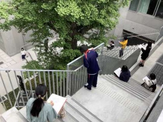 新しい校舎の環境を活かして、中庭にある銀杏の木を取り巻く階段などを活用して、建物や銀杏の木などのデッサンを、思い思いの画材で描いていました。
