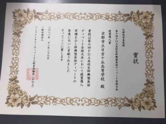 今年度は2年次生2名,1年次生1名,3名のチームで全国大会に参加しましたが,全国大会には参加できなかったものの,京都府の講習や試合に参加している1年次生メンバーが合計7名おり,次年度への期待も大きいところです。今後も生徒たちがディベート活動を行って参りますので引き続き応援よろしくお願いいたします。