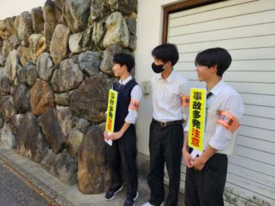 最初に警察署の方から今年の自転車事故の件数などを聞き、注意の必要性をしっかり受け止め声掛けをできました。また今年度から自転車のヘルメット着用が努力義務化したこともあり、それについてもポスターを持って伝えることができました。学校の前の道のみに限らず、自転車・歩行者とも交通安全の意識を高め注意していきたいものです。