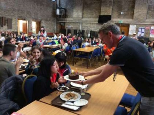 写真(下) 誕生日の生徒にバースデーケーキでサプライズのお祝い