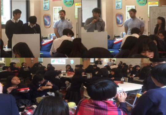 11月12日(月)今年度2回目の「HELLO Village Week」が始まり、昼休みの英語村コミュニケーションスペースに、多くの生徒や教職員が集まりました。ALTのジョンとエイスリンの司会で、オープニングセレモニーが始まりました。最初に、北村副校長から挨拶があり、続いて英語村委員長・副委員長から「HELLO Village Week」をエンジョイしようと呼びかけのメッセージがあり、続いてクリス村長から1週間のプログラムやミッションの説明と激励の言葉がありました。もちろんすべてのメッセージが英語で行われました。最後に、吹奏楽部による「学園天国」の演奏がオープニングセレモニーに華を添えてくれました。この期間に多くの生徒や教職員が英語村に集まって楽しく英語を学んでくれることを願っています。放課後の「OPEN ESS」もESS部ではない生徒もオープン参加し、普段のESS部の活動を一緒に楽しんでいました。
