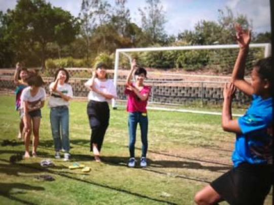 オーストラリアの自然について学んだり、アボリジニのダンス、ブーメラン体験などをさせていただきました。写真は、アボリジニのダンスをする際のペインティングを施してもらい、魚やエミュを主題としたダンスを踊る様子です。大変有意義な時間を過ごしました。