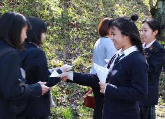 本日、日吉坂にて、各部活動の先輩たちから新入生に向けて部活動勧誘のビラ配りが行われました。上級生の中にも緊張している生徒もいれば新入生から笑顔がこぼれる一面もありました。