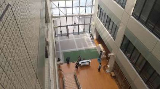 12月14日、本校アトリウムで京都工芸繊大学機械工学系ロボティクス研究室による、ドローンの実証実験が行われました。この実験は、将来的には“空飛ぶ自動車”をめざす研究に必要なもので、ドローンを降下させる際、ボルテックスリングステートと呼ばれる、飛行を乱す現象の発生の条件等を検証するものだそうです。その実験に、風などの外乱がない高さを確保できる空間として、5階ま…