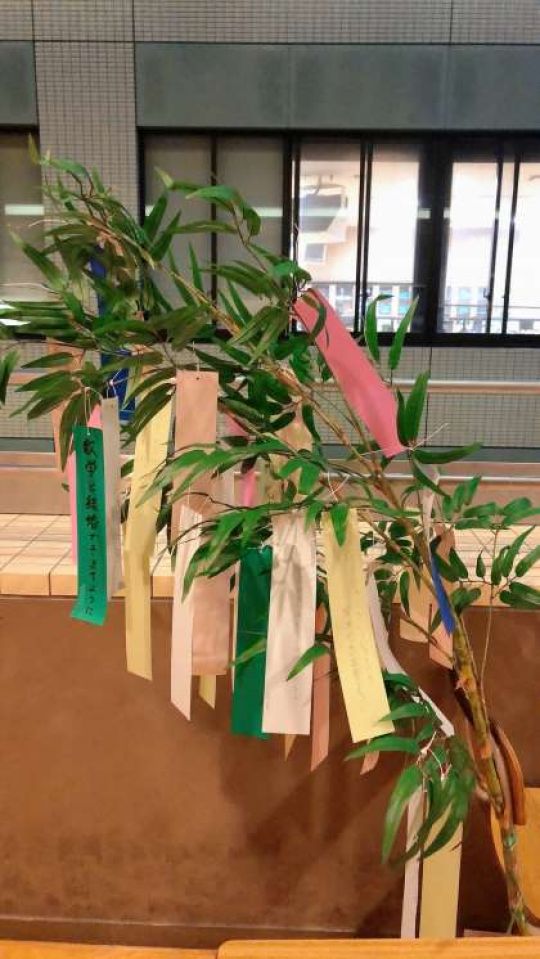 中:クラス担任が持ってきた笹に揺れる短冊。