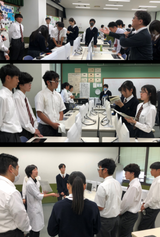 日々の学校生活や行事の様子等について、7ブースに分かれ、各ブース1年生スタッフ生徒3~4人でプレゼンテーションを行いました。
