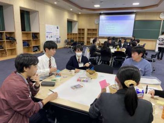プレゼンテーションの後には,高校生と大学院生がグループに分かれてワークショップに取り組みました。テーマは「将来の防災はどうなっている?」です。生徒たちは大学院生のみなさんと一緒に画用紙と付箋を使って、多くのアイデアを整理しながら,これからの情報社会についての考察を深めていきました。最後のワークショップの議論内容の報告は堀川高校と西京高校の代表が担当し,各グループで出されたアイデアの内容を参加者みんなで共有しました。