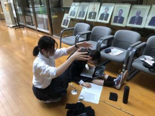 ある日の授業中、堀川高校のシンボル、北館と南館をつなぐ吹き抜け「アトリウム」を覗くと、何人もの生徒が、座り込んで作業中。話を聞くと「アルミの小皿を落として地面に到達するまでの時間」を高さを変えながら、何度も測っているとのこと。先ほどまでは、アトリウムの構造を生かして、2階の渡り廊下から1階に向かって落としたりもしていた様子。