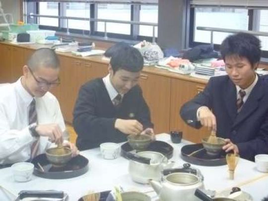 授業では、講義を聞いた後にビデオで理解を深めて実践に入りました。調理実習室を使って簡易な形式です。一人ひとりが茶碗に抹茶を入れてお湯を注ぎ、茶筅で心をこめて丁寧にかき回していました。飲み手は運ばれてきたお点前を飲み口が正面にならないようにお茶碗を少しまわしていただきました。生徒たちの中には、茶道部の女子生徒がいて茶筅の使い方やおじぎの仕方などを教えあっていました。京都は茶道発祥の町、お茶を頂く機会に出会う時に体験した立居振舞いでお点前を楽しんでくれることでしょう。
