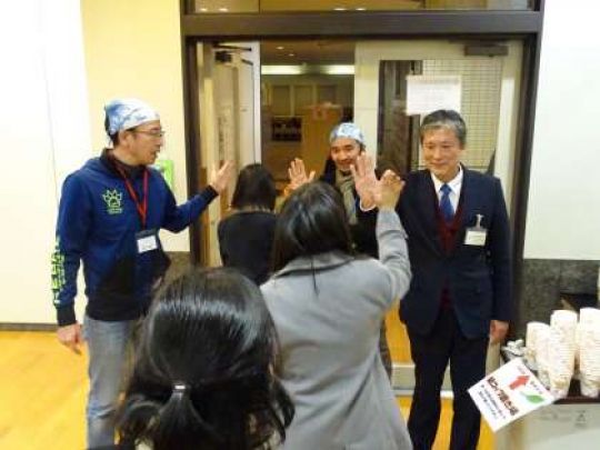 写真下:恩田校長、PTA会長、副会長との合格ハイタッチ!