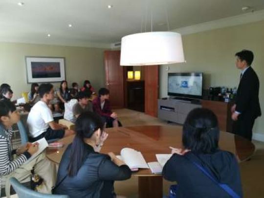 シドニーに移動し、午前中は全体研修、午後からは班別研修を行いました。全体研修は3グループに分かれ、日本総領事館、日豪プレス、ヒルトンホテルに行き、オーストラリアで仕事しておられる日本の方々に、海外ならではのやり甲斐やご苦労を伺いました。ホームステイ効果か、積極的に質問をしている姿が印象的でした。その後の班別研修では、それぞれの課題テーマに基づいてシドニーに元気よく繰り出しました。ボンダイビーチに行き「アンケートにむっちゃ協力してくれはったし、何よりビーチがむっちゃよかった!」という班や、海洋博物館に行き「軍艦に詳しい人や世界史に詳しい人に話が聞けてとても面白かった。」という班など、「楽しかった、面白かった話」をたくさんしてくれました。更に、とうとう「オーストラリアで住みたい!」と言う人まで出てきました。