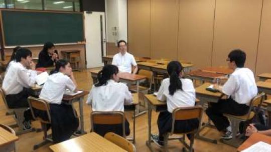 講演会終了後には,さらに質問をしたい生徒が集まり松村先生を囲んで座談会を行いました。生徒たちの熱心な質問に、松村先生も丁寧に対応してくださり,生徒たちはさらに多くの気付きや思考の深まりを得ることができました。予定時間を大幅に越えての座談会,本当にありがとうございました。