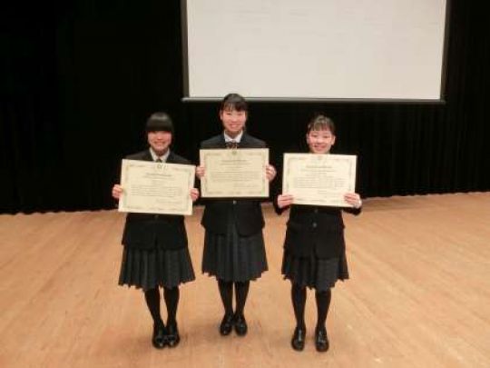 1月25日(土)、京都堀川音楽高等学校ホールにて行われました第6回京都市立高等学校英語プレゼンコンテスト(京都市立高等学校教育研究会英語部会・高校コンソーシアム京都・京都市教育委員会主催、京都市立高等学校校長会後援、京都外国語大学協賛)において、本校1年生の中村まなみさんが個人の部で優秀賞を、2年生の木村百花さんと花井日華里さんのグループ「Apples」がグループの部で最優秀賞を受賞しました。