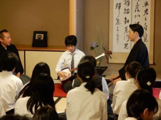 生徒達は、初めての三味線演奏に興味津々、質問が飛び交う中、最後は大きな拍手に包まれて楽しいひと時を過ごすことができました。