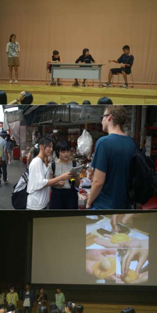 3日目のフィールドワークとその発表を行いました。午前中からお昼にかけて各班が街へ出て、観光に訪れた外国人にインタビューをします。また、各班一つずつ京都の文化に触れるワークショップに参加し、生徒は帰ってきた後、午前中の活動をみんなに報告します。報告のプレゼンテーションにはiPhone,iPad等のICT機器を使い、自分たちが撮影した写真をプロジェクタに投影しました。
